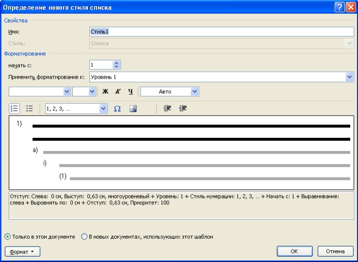 Если необходимо сформировать новый стиль списка, то необходимо воспользоваться пунктом "Определить новый стиль списка..". В появившемся окне можно настроить все необходимые параметры стиля, а также задать область действия нового формата.