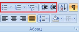 Для работы со списками служат пять верхних кнопок панели "Абзац" (вкладка "Главная")