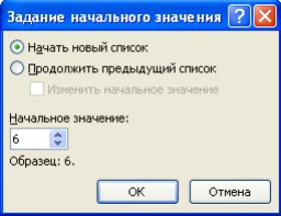 В появившемся окне в зависимости от поставленной задачи надо установить переключатель в одно из двух положений: "Начать новый список" или "Продолжить предыдущий список". В поле "Начальное значение" задайте номер первого пункта списка.