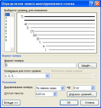 При необходимости редактирования многоуровневого списка, щелкните кнопкой мыши на кнопке "Многоуровневый список" и в появившемся окне - "Определить новый многоуровневый список..". Здесь можно настроить формат номера, расстояние, тип шрифта и другие параметры списка.